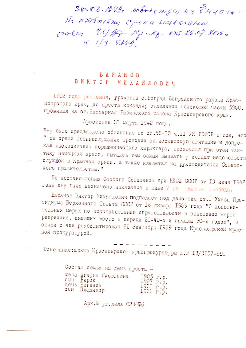 Баранов Виктор Михайлович подпадает под действие ст. 1 Указа Президиума Верховного Совета СССР от 16 января 1989 года “О дополнительных мерах по восстановлению справедливости в отношении жертв репрессий, имевших место в период 30-40-х и начала 50-х годов”, в связи с чем реабилитирован 21 сентября 1989 года Красноярской краевой прокуратурой.