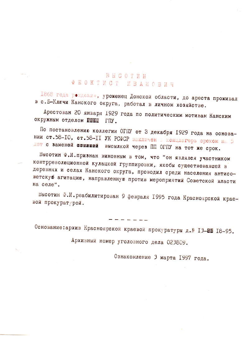 Высотин Ф.И. признан виновным в том, что “он являлся участником контрреволюционной кулацкой группировки, якобы существовавшей в деревнях и селах Канского округа, проводил среди населения антисоветскую агитацию, направленную против мероприятий Советской власти на селе”.