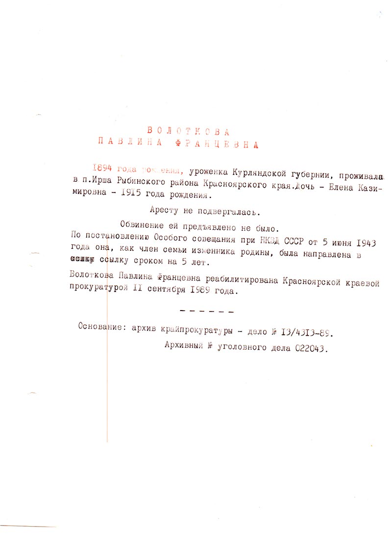 Волоткова Павлина Францевна реабилитирована Красноярской краевой прокуратурой 11 сентября 1989 года.