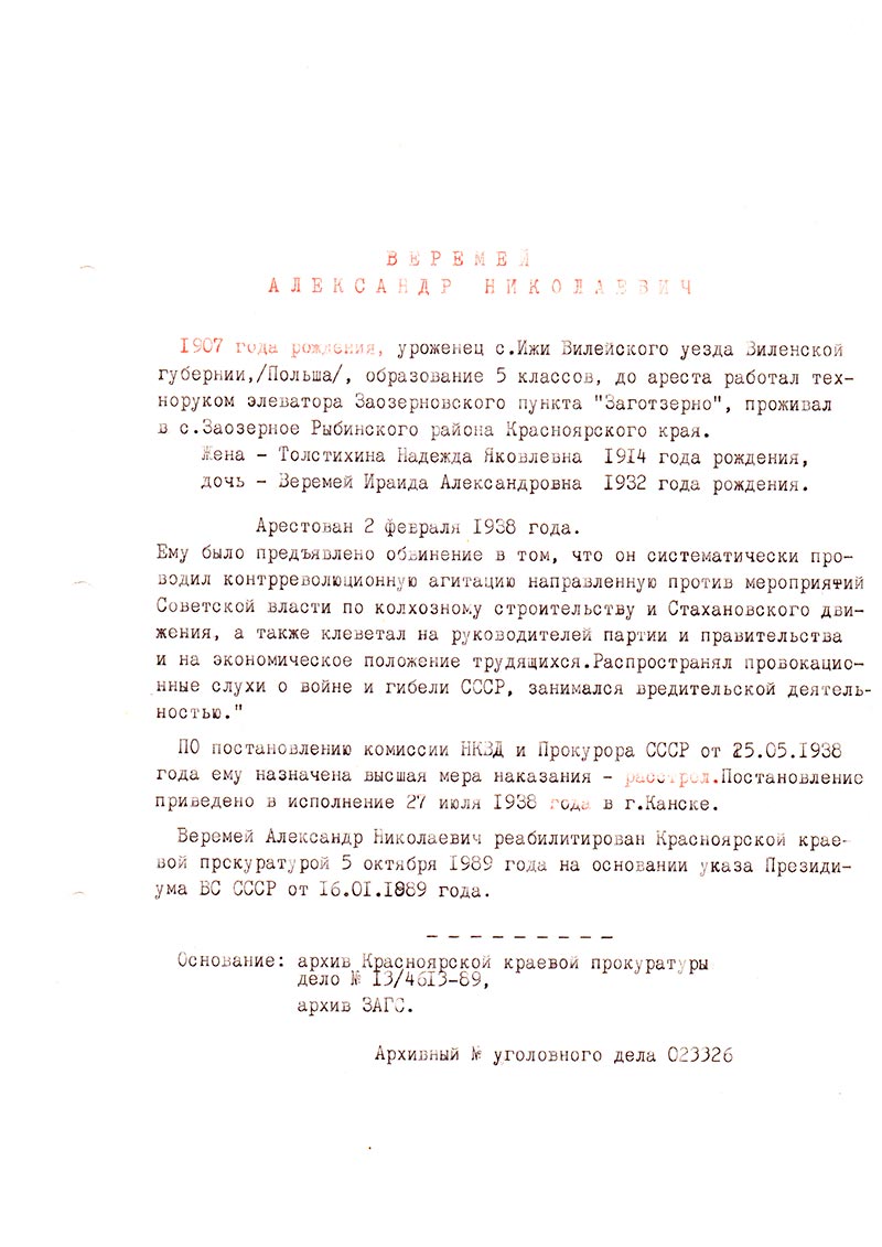 Веремей Александр Николаевич реабилитирован Красноярской краевой прокуратурой 5 октября 1989 года на основании указа Президиума ВС СССР от 16.01.1989 года.