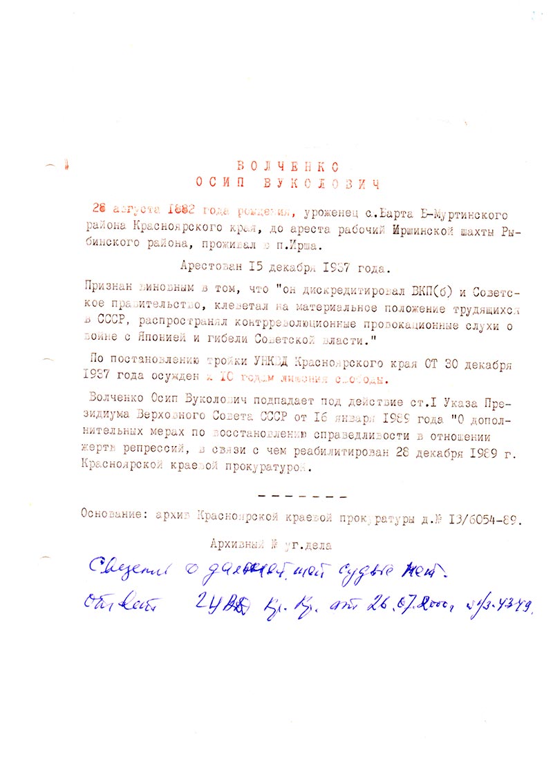 Волченко Осип Вуколович подпадает под действие ст. 1 Указа Президиума Верховного Совета СССР от 16 января 1989 года “О дополнительных мерах по восстановлению справедливости в отношении жертв репрессий”, в связи с чем реабилитирован 28 декабря 1989 г. Красноярской краевой прокуратурой.