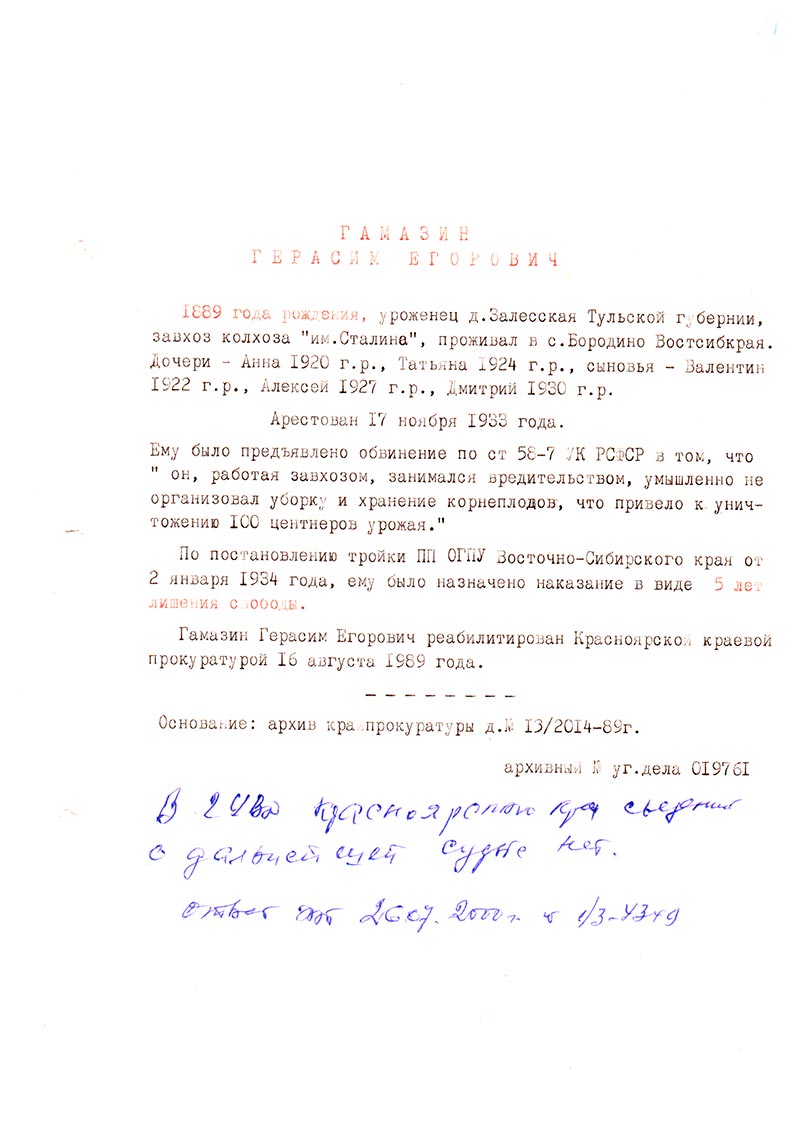 Гамазин Герасим Егорович реабилитирован Красноярской краевой прокуратурой 16 августа 1989 года.