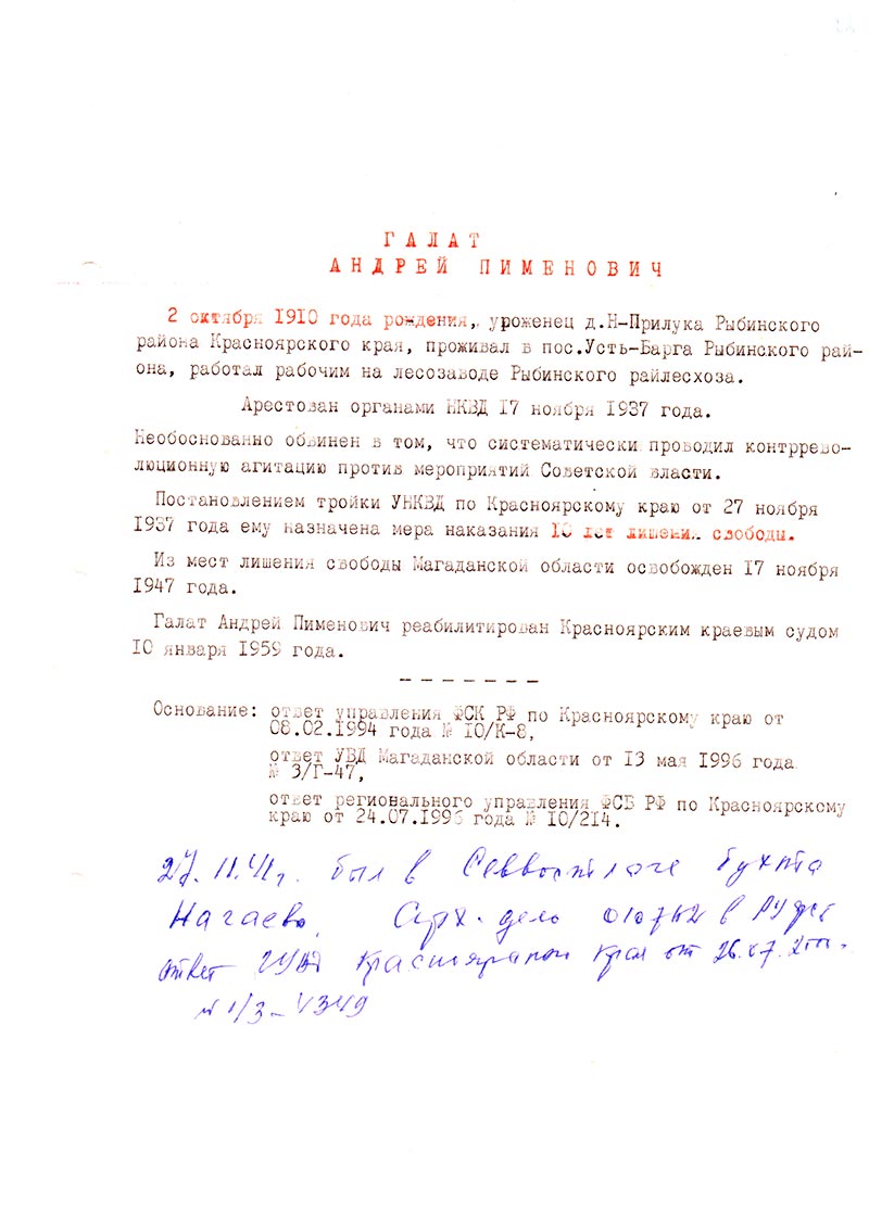 Галат Андрей Пименович реабилитирован Красноярским краевым судом 10 января 1959