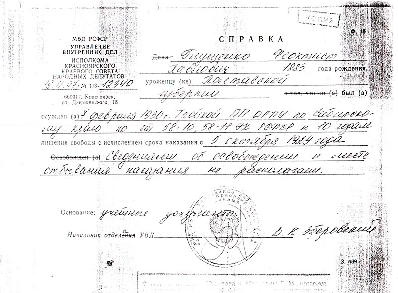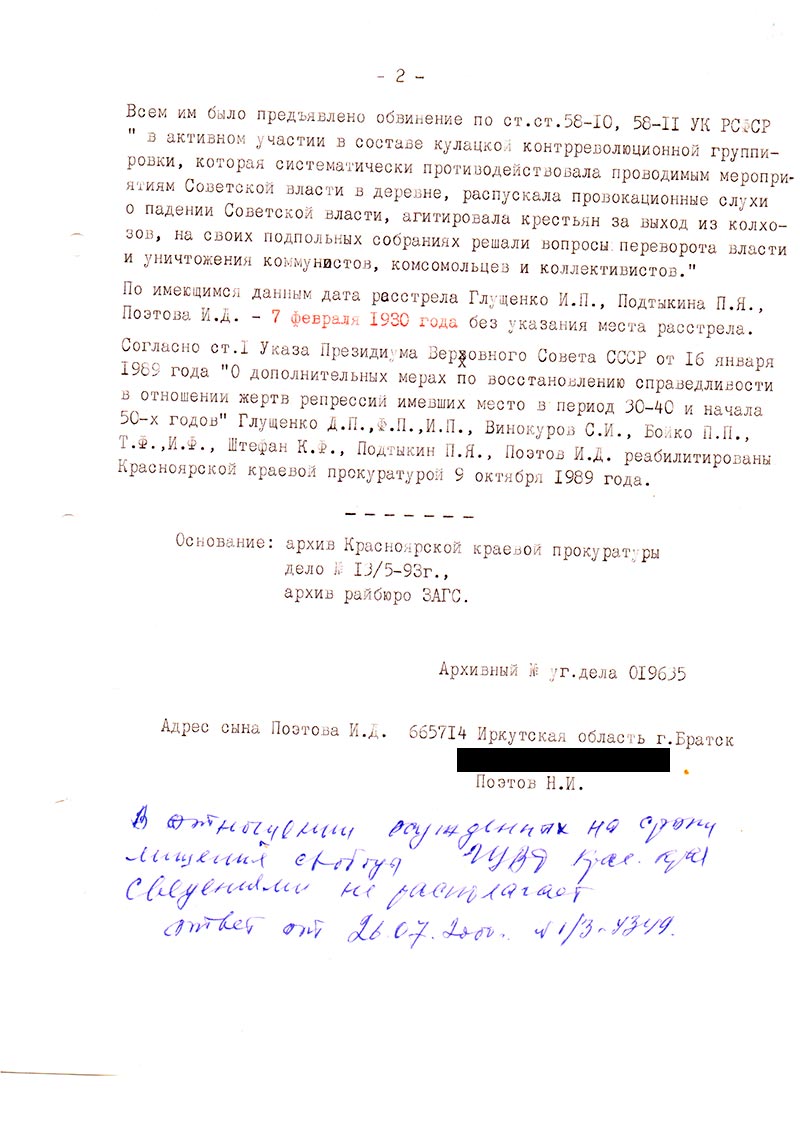 Согласно ст. 1 Указа Президиума Верховного Совета СССР от 16 января 1989 года “О дополнительных мерах по восстановлению справедливости в отношении жертв репрессий имевших место в период 30–40 и начала 50-х годов” Глущенко Д.П., Ф.П., И.П., Винокуров С.И., Бойко П.П., T.Ф.,И.Ф., Штефан К.Ф., Подтыкин П.Я., Поэтов И.Д. реабилитированы Красноярской краевой прокуратурой 9 октября 1989 года.
