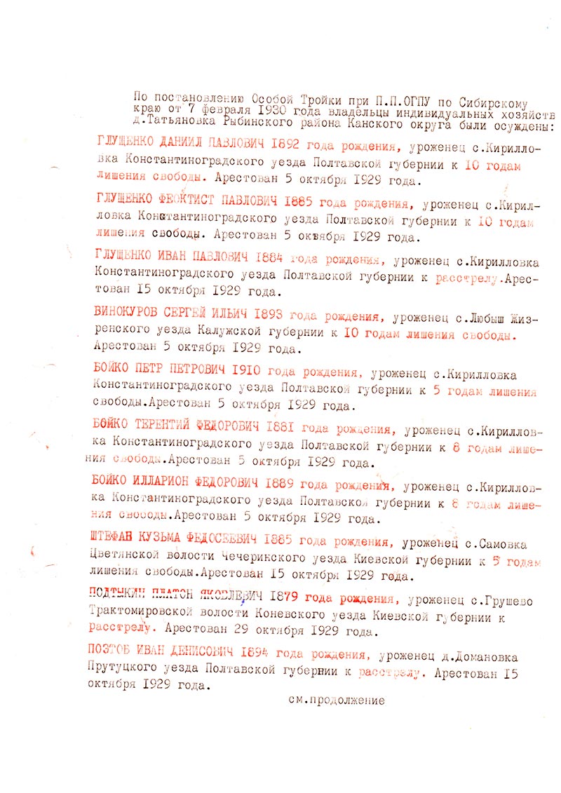 По постановлению Особой Тройки при П.П. ОГПУ по Сибирскому краю от 7 февраля 1930 года владельцы индивидуальных хозяйств д. Татьяновка Рыбинского района Канского округа были осуждены: