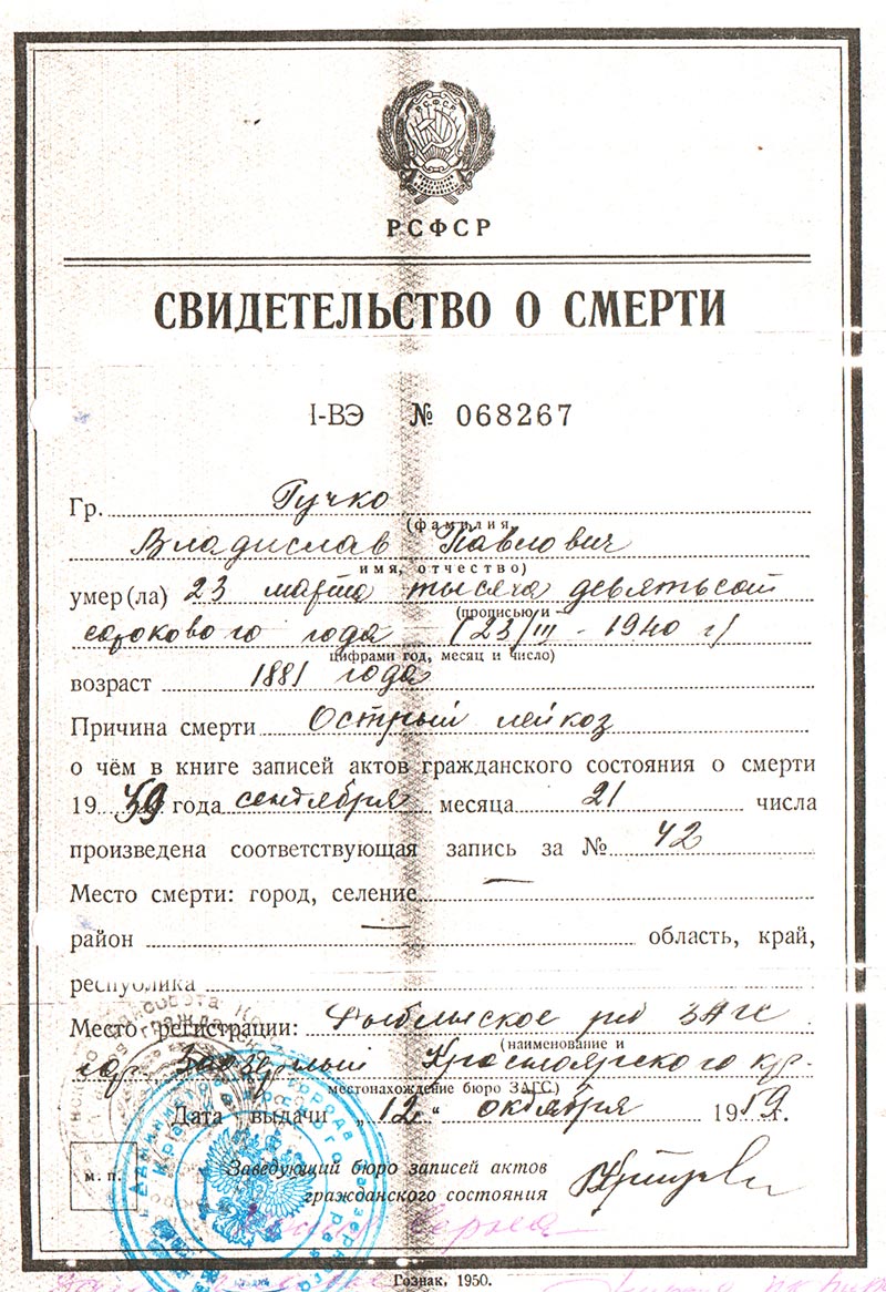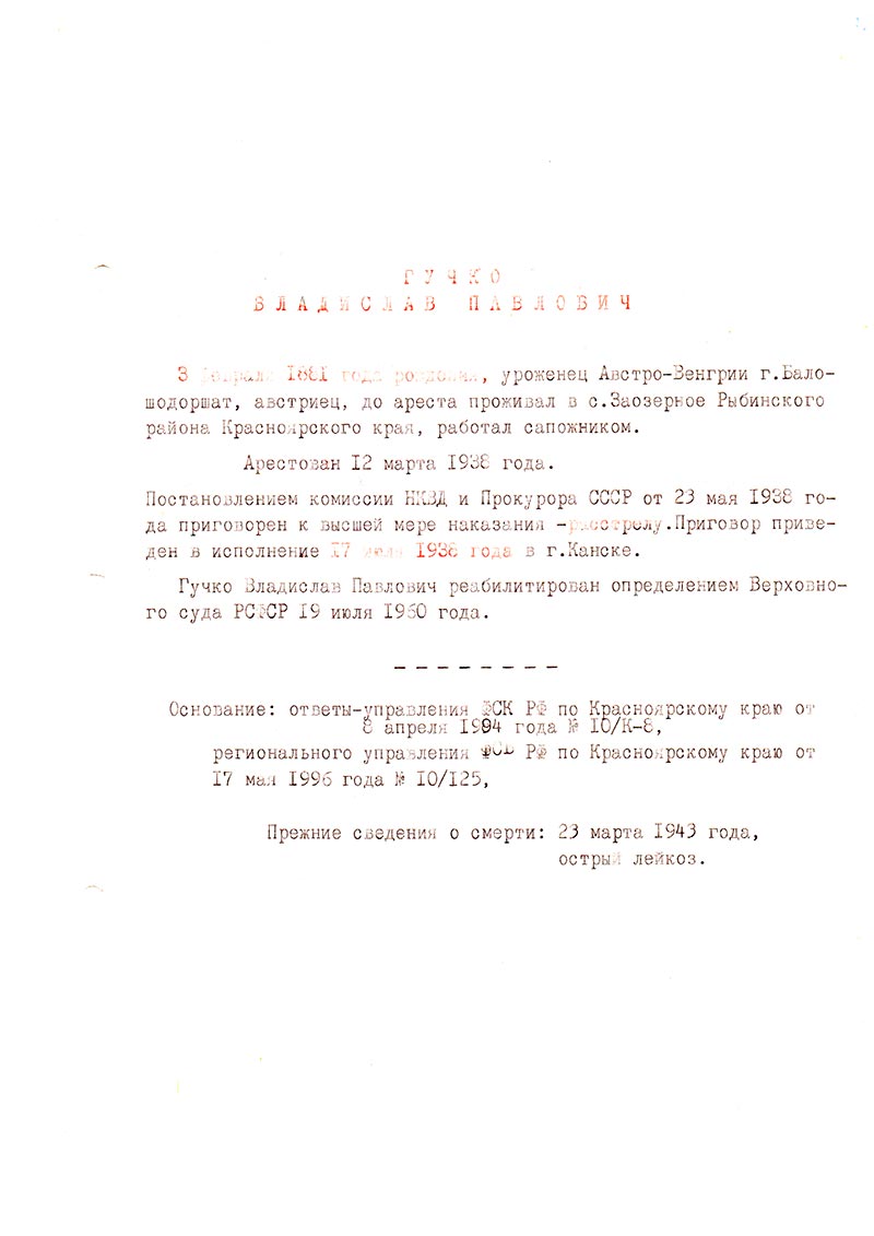 Гучко Владислав Павлович реабилитирован определением Верховного суда РСФСР 19 июля 1960 года.