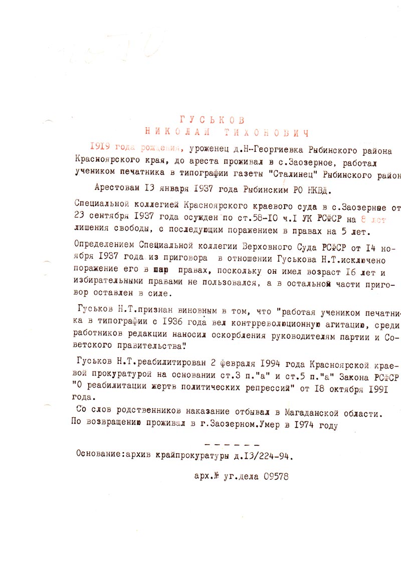 Гуськов Н.Т. признан виновным в том, что “работая учеником печатника в типографии с 1936 года вел контрреволюционную агитацию, среди работников редакции наносил оскорбления руководителям партии и Советского правительства”.