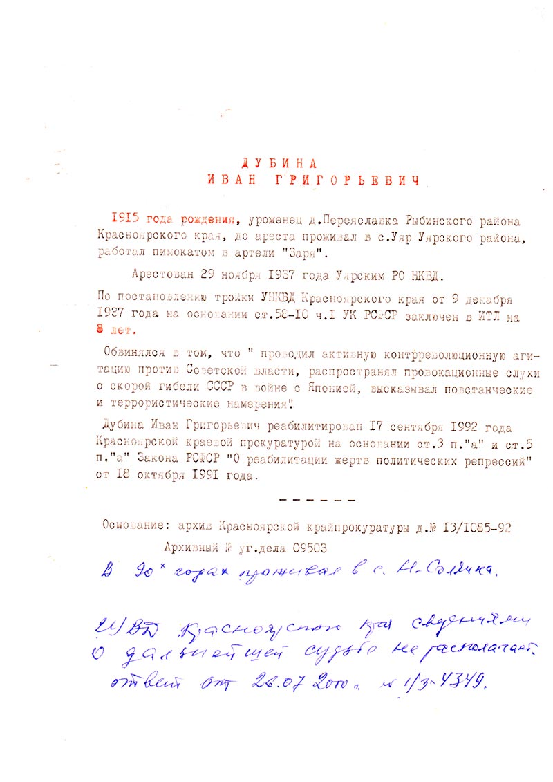 Дубина Иван Григорьевич реабилитирован 17 сентября 1992 года Красноярской краевой прокуратурой на основании ст. 3 п. “а” и ст. 5 п. “а” Закона РСФСР “О реабилитации жертв политических репрессий” от 18 октября 1991 года.