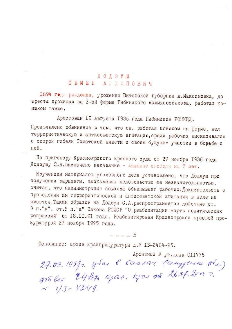 Изучением материалов уголовного дела установлено, что Додэуш при получении зарплаты, высказывал недовольство ее незначительностью, считая, что администрация совхоза обманывает рабочих. Доказательств о проведении им террористической и антисоветской агитации в деле не имеется. Таким образом на Додэуш С.А. распространяется действие ст. 3 п. “а” и ст. 5 п. “а” Закона РСФСР “О реабилитации жертв политических репрессий” от 18.10.1991 года. Реабилитирован Красноярской краевой прокуратурой 27 ноября 1995 года.