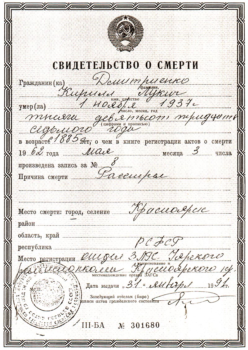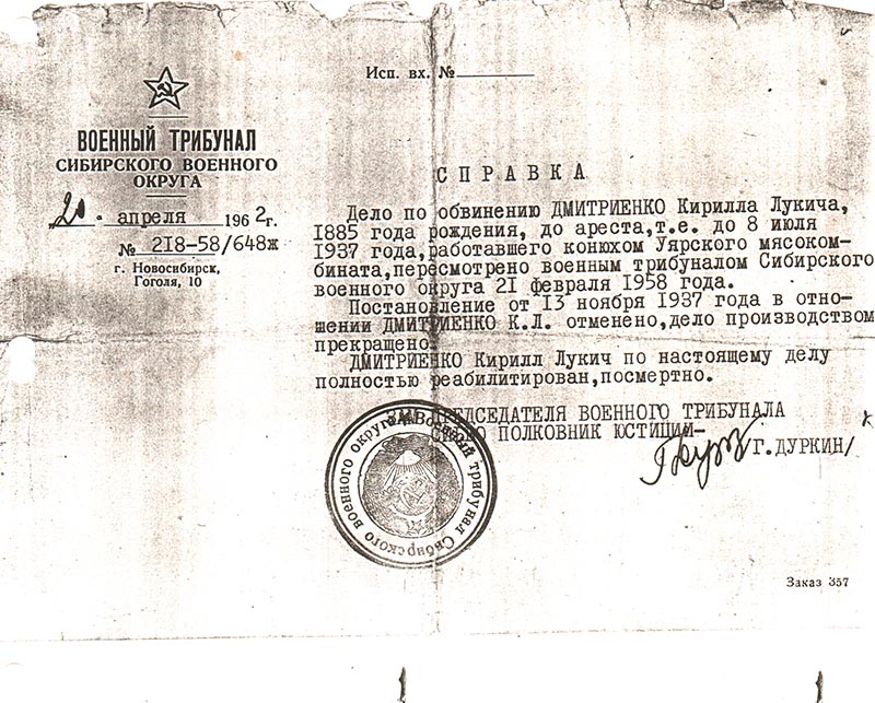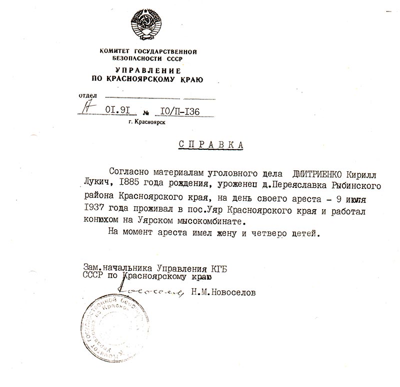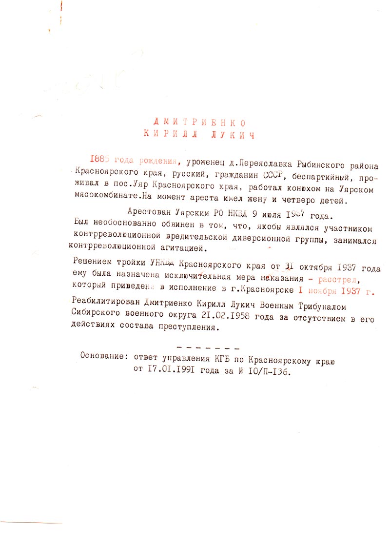 Сообщаем, что Ваш отец — Дмитриенко Кирилл Лукич, 1885 года рождения, уроженец д. Переяславка Рыбинского района Красноярского края, русский, гр-н СССР, беспартийный, проживал в пос. Уяр Красноярского края, работал конюхом на Уярском мясокомбинате, арестован Уярским РО УНКВД 9 июля 1937 года.