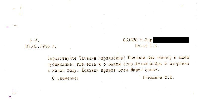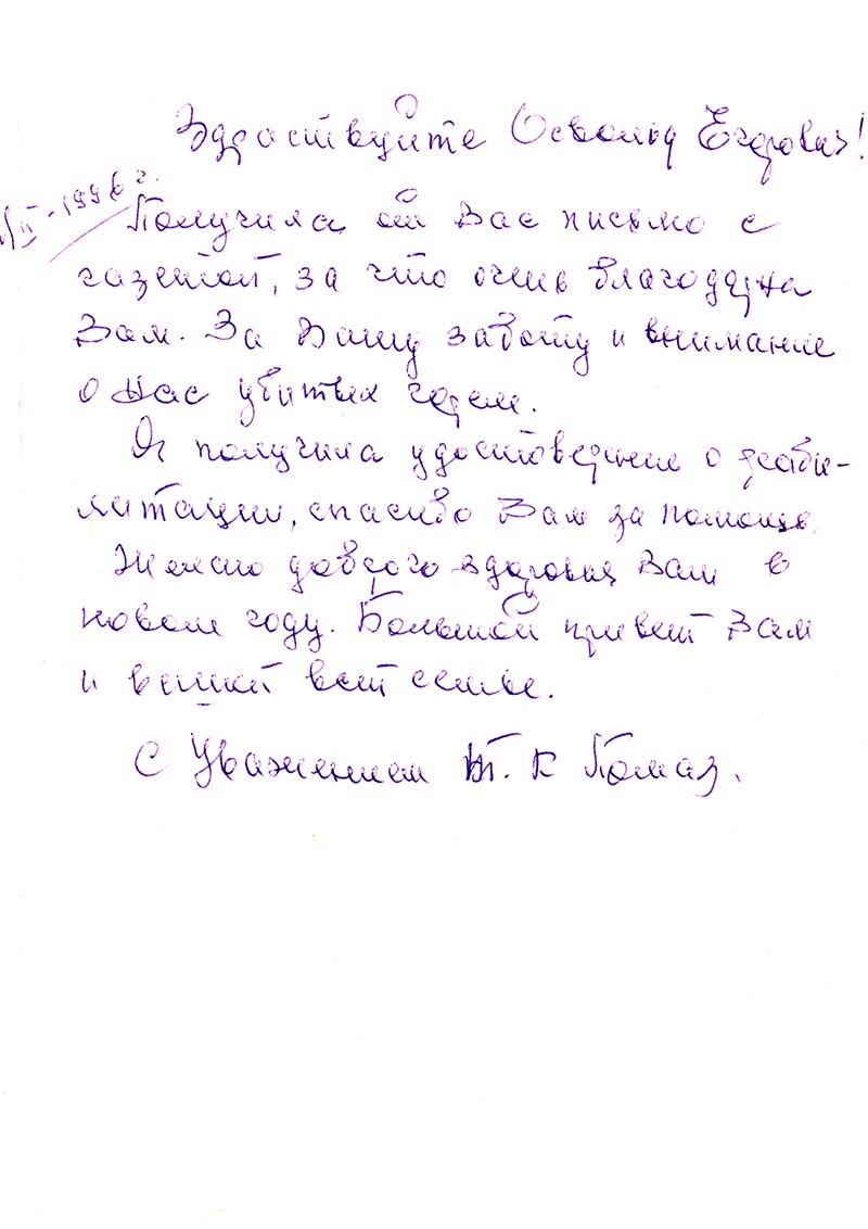 Получила от Вас письмо с газетой, за что очень благодарна Вам. За Вашу заботу и