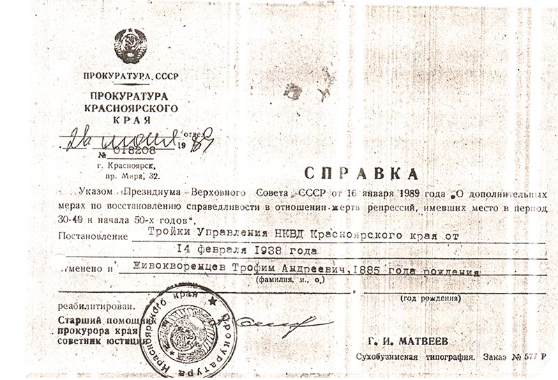Жикворенцев Трофим Андреевич реабилитирован Красноярской краевой прокуратурой 26