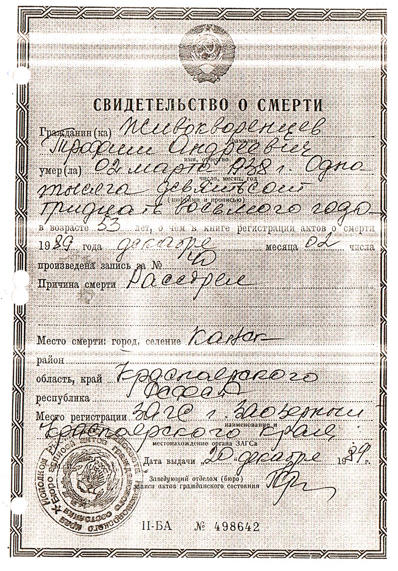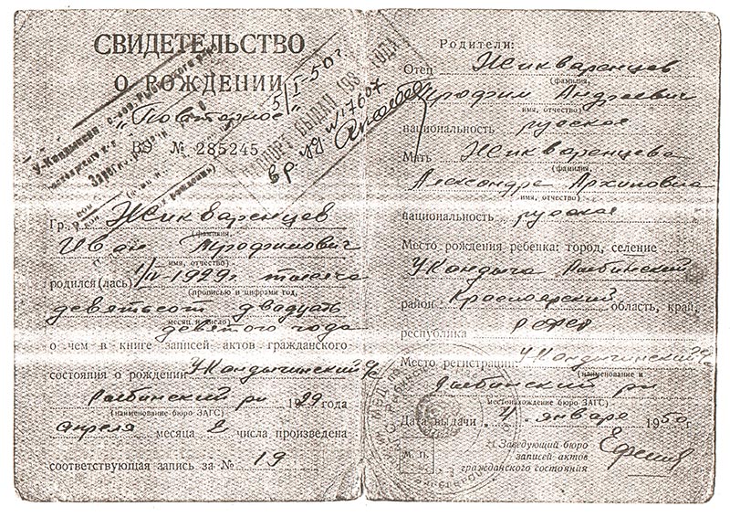 * Здесь и в видетельстве о рождении) фамилия дана в варианте “Жикворенцев”. В справке из прокуратуры и свидетельстве о смерти)— “Живокворенцев”. Всвидетельстве о рождении) — “Живокоренцев”