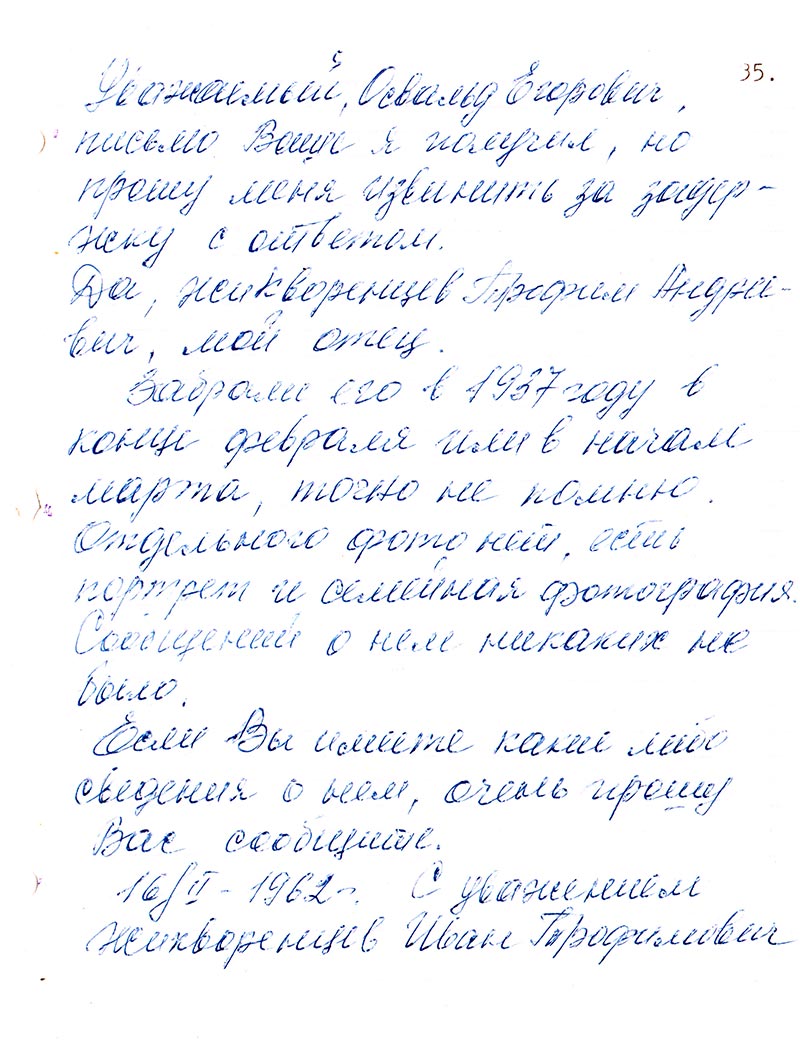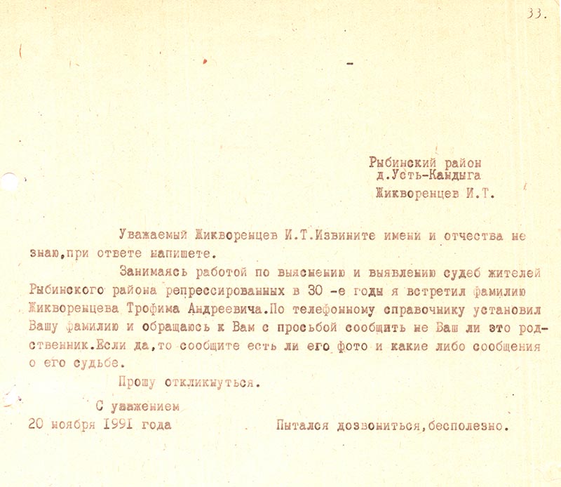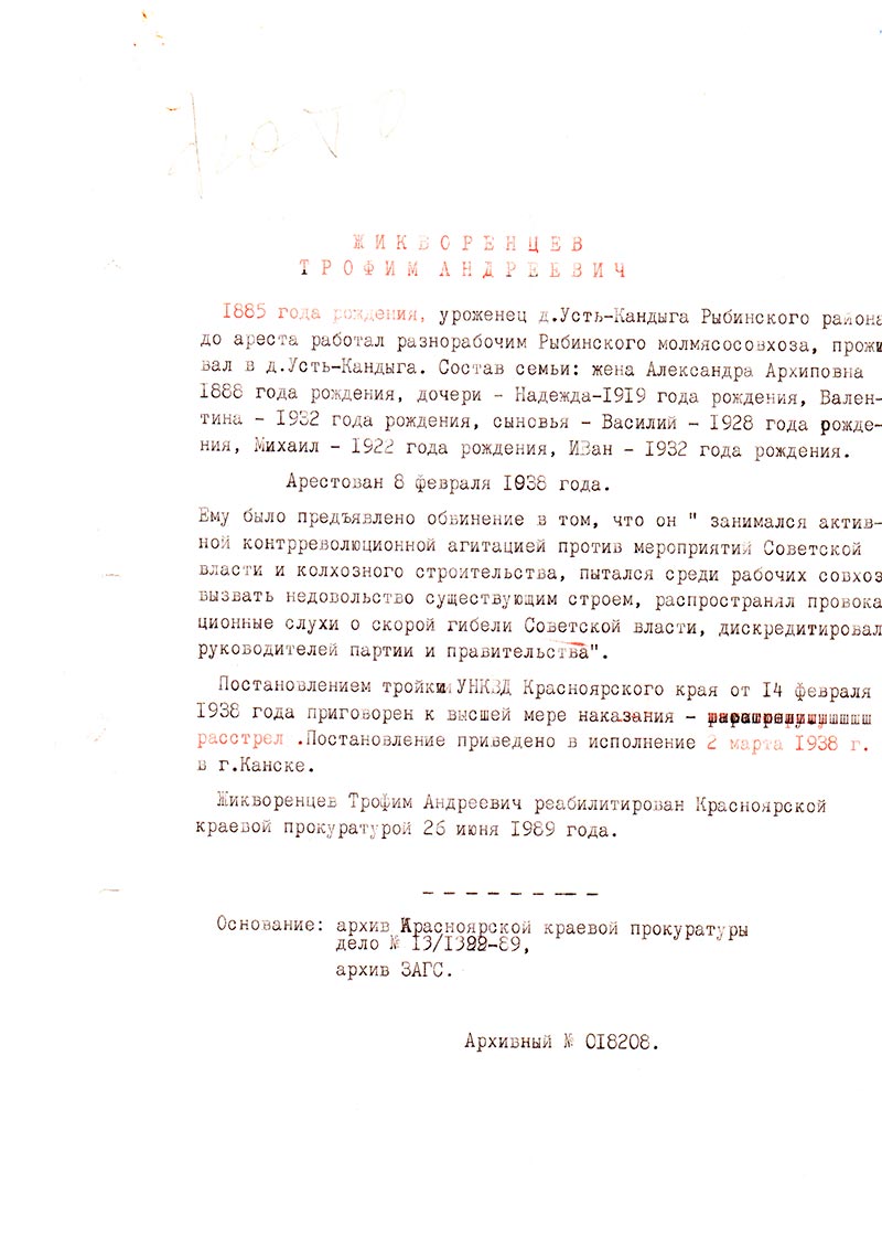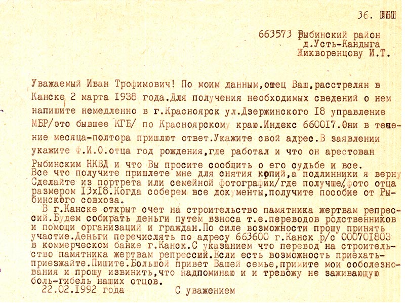 Уважаемый Иван Трофимович! По моим данных, отец Ваш, расстрелян в Канске 2 марта 1938 года. Для получения необходимых сведений о нем напишите немедленно в г. Красноярск ул.Дзержинского 18 управление МБР (это бывшее КГБ)