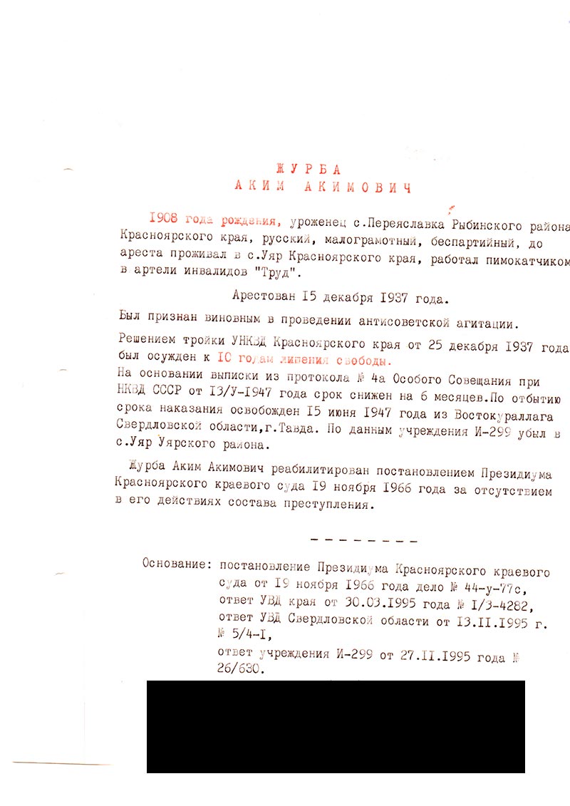 Журба Аким Акимович реабилитирован постановлением Президиума Красноярского краевого суда 19 ноября 1966 года за отсутствием в его действиях состава преступления.