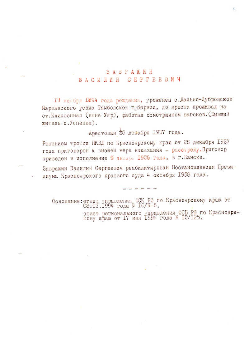 Завражин Василий Сергеевич реабилитирован Постановлением Президиума Красноярского краевого суда 4 октября 1958 года.
