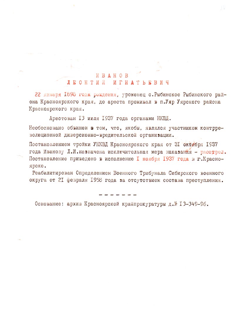 Постановлением тройки УНКВД Красноярского края от 31 октября 1937 года Иванову Л.И. назначена исключительная мера наказания — расстрел.