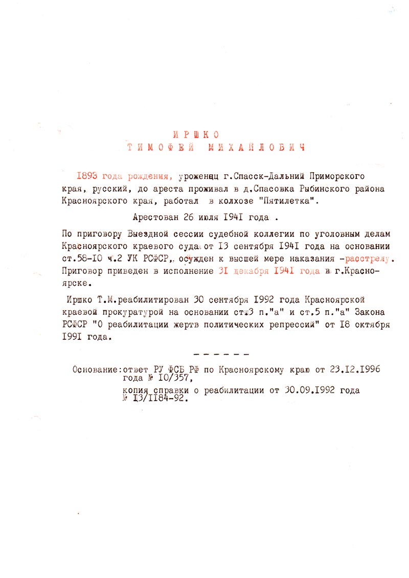 Иршко Т.М. реабилитирован 30 сентября 1992 года Красноярской краевой прокуратурой на основании ст. 3 п. “а” и ст. 5 п. “а” Закона РСФСР “О реабилитации жертв политических репрессий” от 18 октября 1991 года.