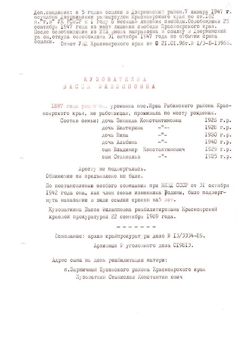 Кузоваткина Васса Филипповна реабилитирована Красноярской краевой прокуратурой