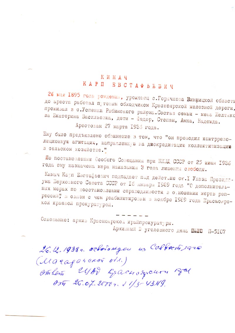 Кимач Карп Евстафьевич подпадает под действие ст. 1 Указа Президиума Верховного Совета СССР от 16 января 1989 года “О дополнительных мерах по восстановлению справедливости в отношении жертв репрессий” в связи с чем реабилитирован в ноябре 1989 года Красноярской краевой прокуратурой.
