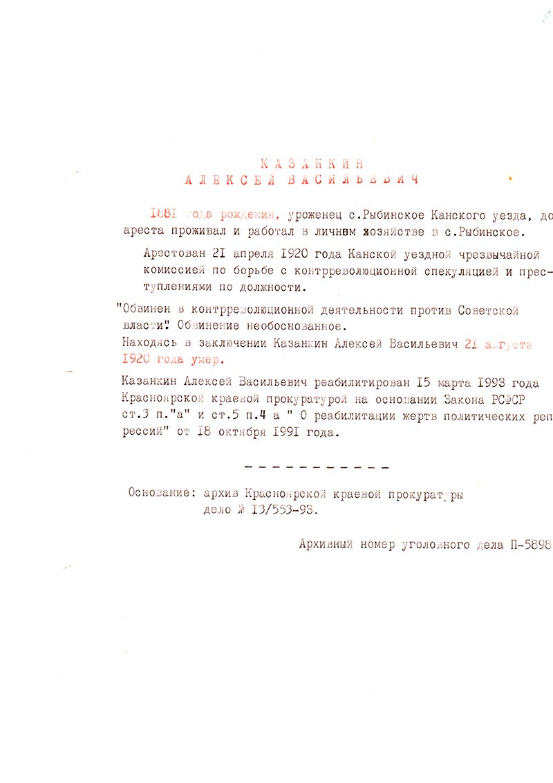 Находясь в заключении Казанкин Алексей Васильевич 21 августа 1920 года умер.