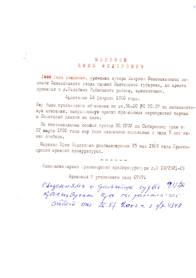 Морозов Ефим Федорович реабилитирован 25 мая 1989 года Красноярской краевой