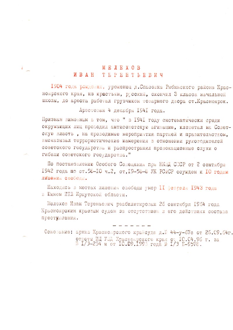 Мелехов Иван Терентьевич реабилитирован 26 сентября 1964 года Красноярским краевым судом за отсутствием в его действиях состава преступления.