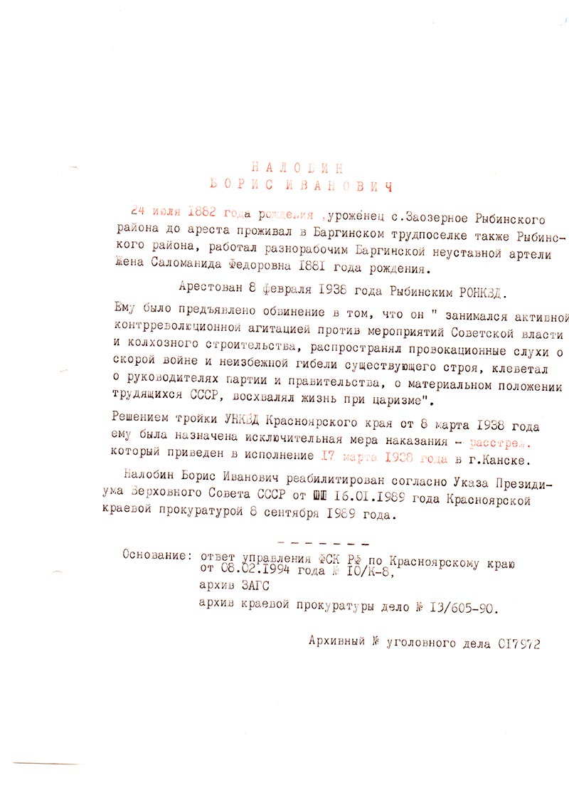 Налобин Борис Иванович реабилитирован согласно Указа Президиума Верховного Совета СССР от 16.01.1989 года Красноярской краевой прокуратурой 8 сентября 1989 года.