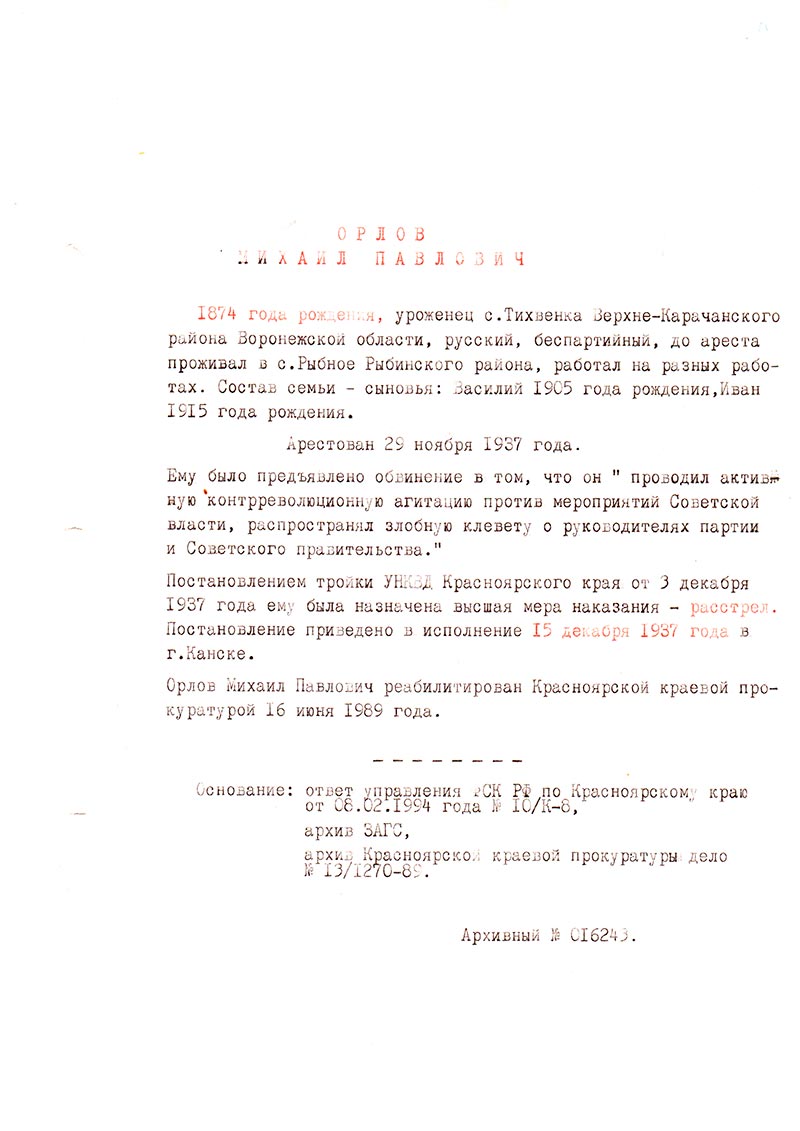 Орлов Михаил Павлович реабилитирован Красноярской краевой прокуратурой 16 июня 1989 года.