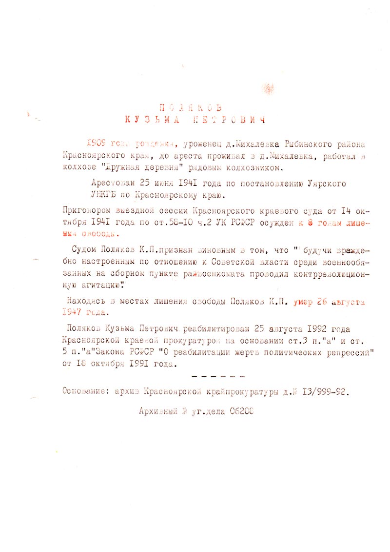 Основание: архив Красноярской крайпрокуратуры д. № 13/999-92.