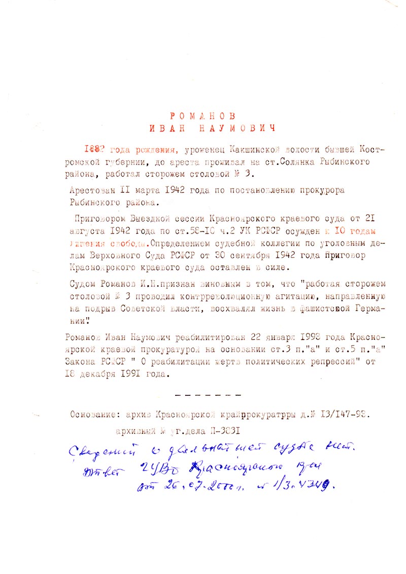 Романов Иван Наумович реабилитирован 22 января 1993 года Красноярской краевой прокуратурой на основании ст. 3 п.“а” и ст. 5 п.“а” Закона РСФСР “О реабилитации жертв политических репрессий” от 18 октября 1991 года.