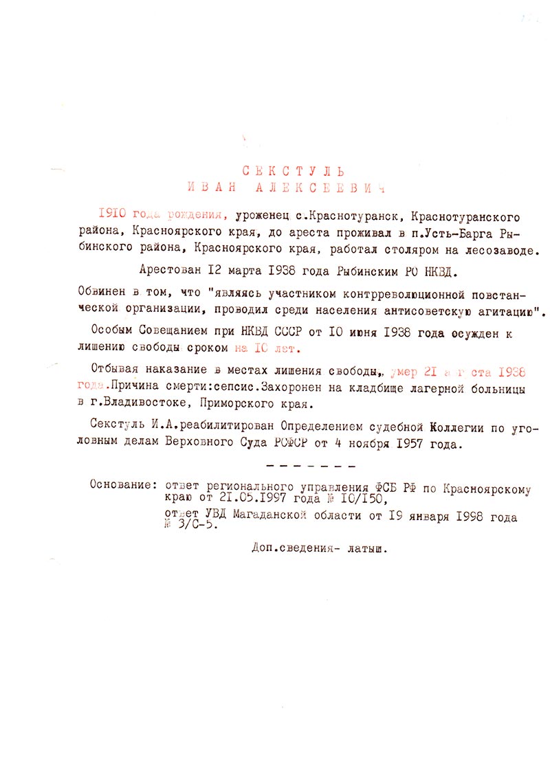 Секстуль И.А. реабилитирован Определением судебной коллегии по уголовным делам Верховного Суда РСФСР от 4 ноября 1957 года.