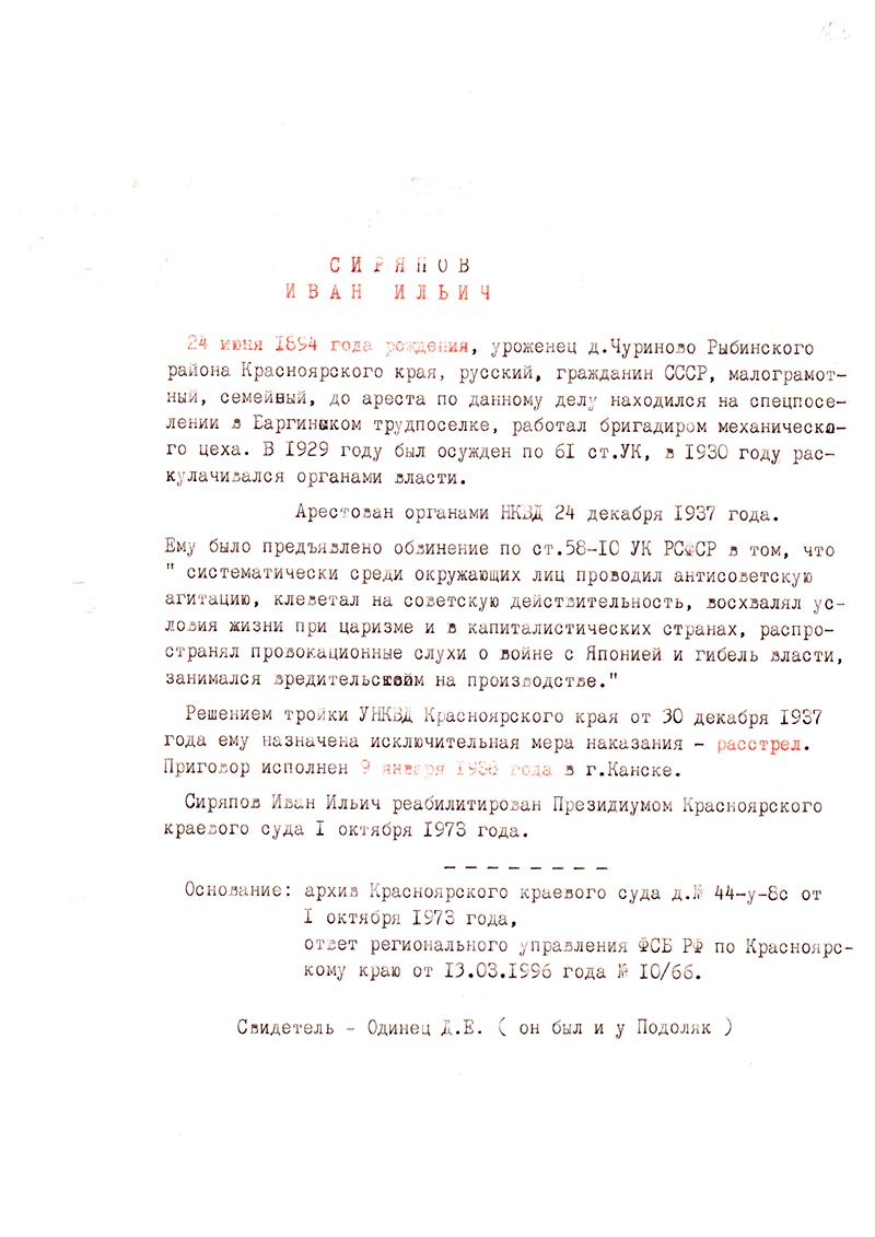 Сиряпов Иван Ильич реабилитирован Президиумом Красноярского краевого суда 1 октября 1973 года.