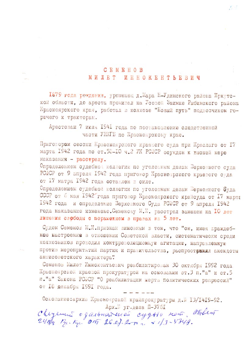 Семенов Милет Иннокентьевич реабилитирован 30 октября 1992 года Красноярской краевой прокуратурой на основании ст. 3 п.“а” и ст. 5 п.“а” Закона РСФСР “О реабилитации жертв политических репрессий” от 18 октября 1991 года.
