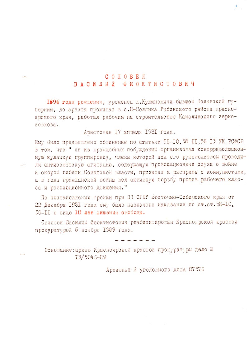 Соловей Василий Феоктистович реабилитирован Красноярской краевой прокуратурой 6 ноября 1989 года.
