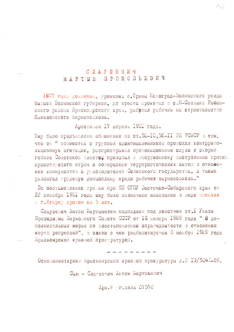 Слаушевич Антон Мартынович подпадает под действие ст. 1 Указа Президиума Верховного Совета СССР от 16 января 1989 года “О дополнительных мерах по восстановлению справедливости в отношении жертв репрессий”, в связи с чем реабилитирован 6 ноября 1989 года Красноярской краевой прокуратурой.