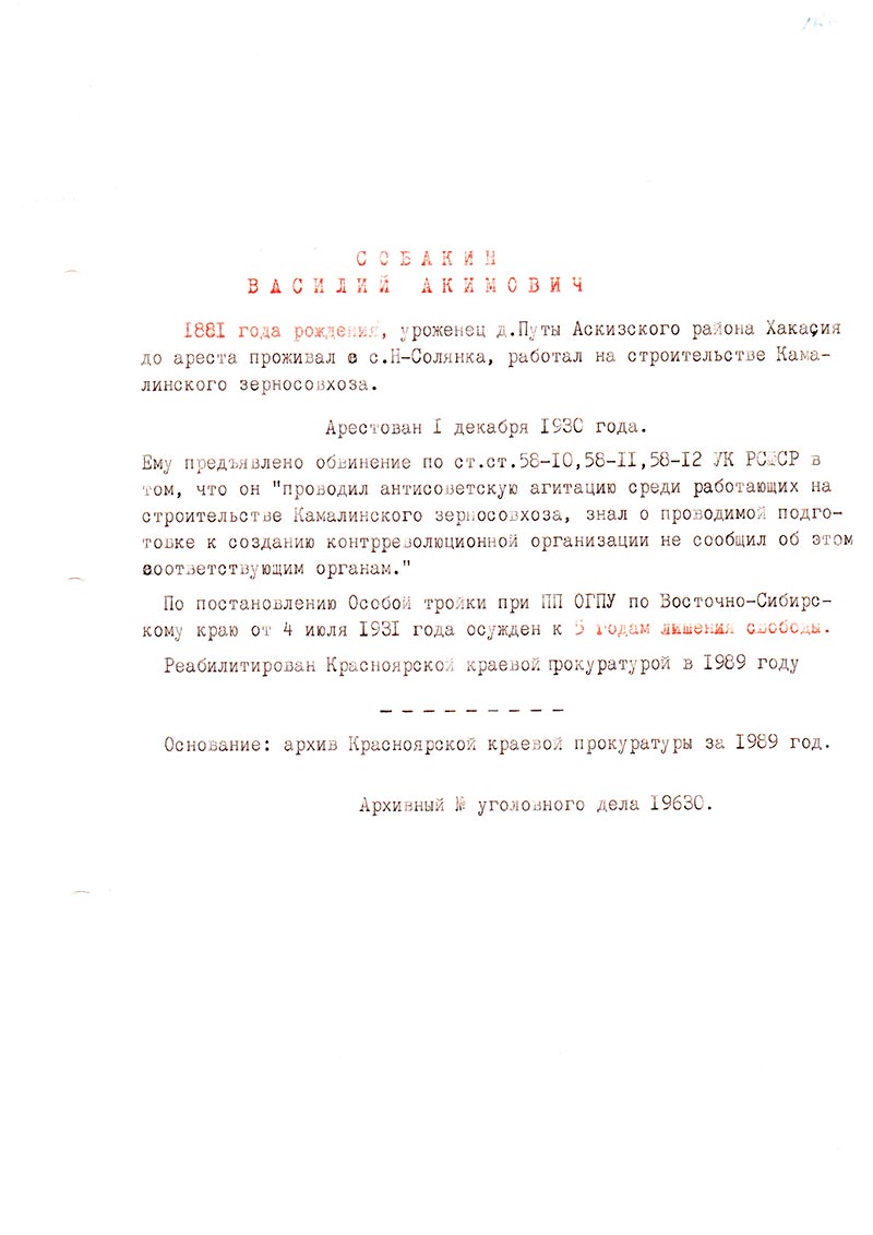 Реабилитирован Красноярской краевой прокуратурой в 1989 году.