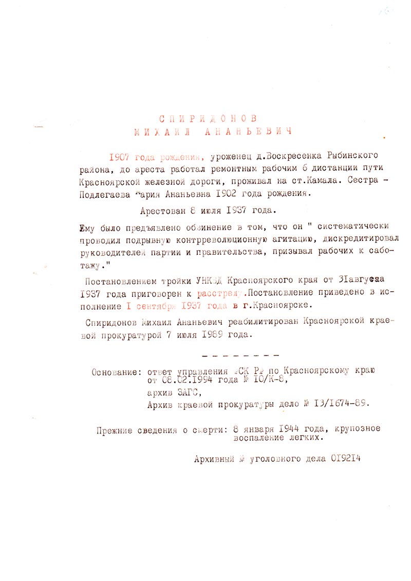Спиридонов Михаил Ананьевич реабилитирован Красноярской краевой прокуратурой 7 июля 1989 года.