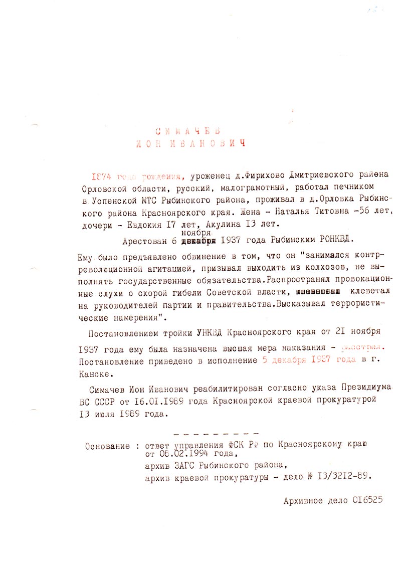 Симачев Ион Иванович реабилитирован согласно указа Президиума BC CCCP от 16.01.1989 года Красноярской краевой прокуратурой 13 июля 1989 года.