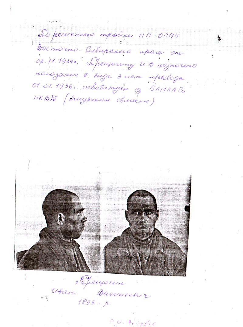 По решению тройки ПП ОГПУ Восточно-Сибирского края от 02.01.1934 г. Трещагину И.В. назначено наказание в виде 3 лет л/свободы.