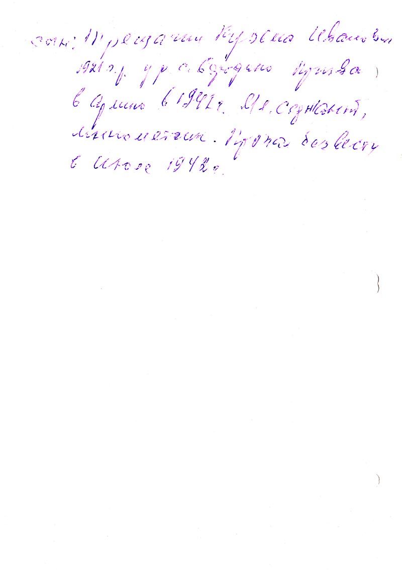 Сын Кузьма рожд 1921 г. Призван в Армию в 1941 г. Мл. сержант, минометчик.