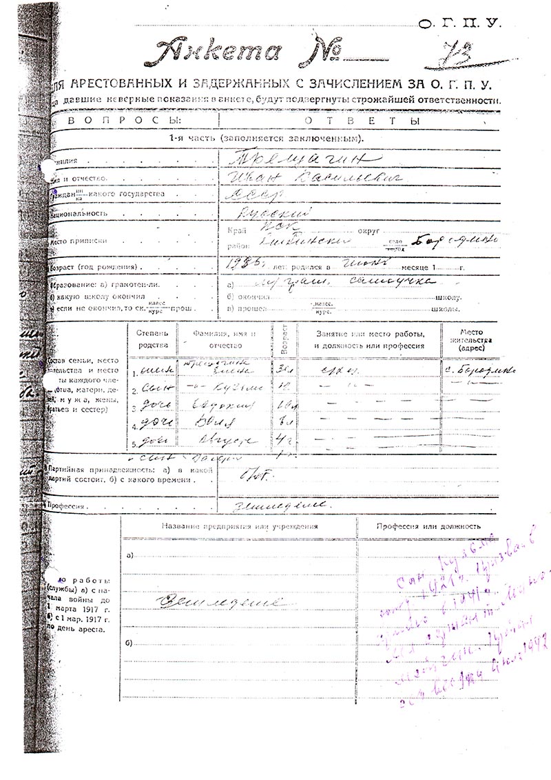 * Не упомянут сын Кузьма, 1921 г.р. Информация о нем в анкете заключенного