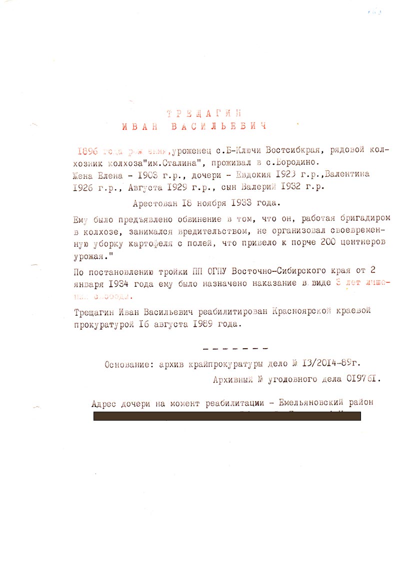 Трещагин Иван Васильевич реабилитирован Красноярской краевой прокуратурой 16 августа 1989 года.