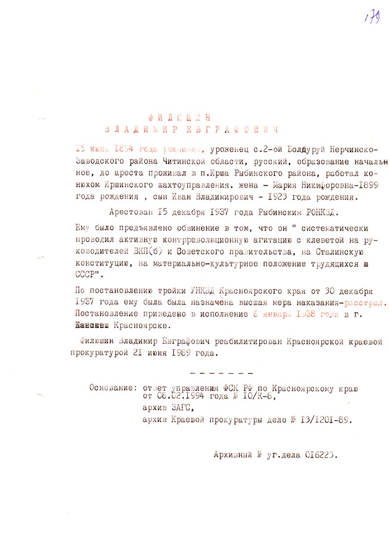 Филюшин Владимир Евграфович реабилитирован Красноярской краевой прокуратурой 21 июня 1989 года.
