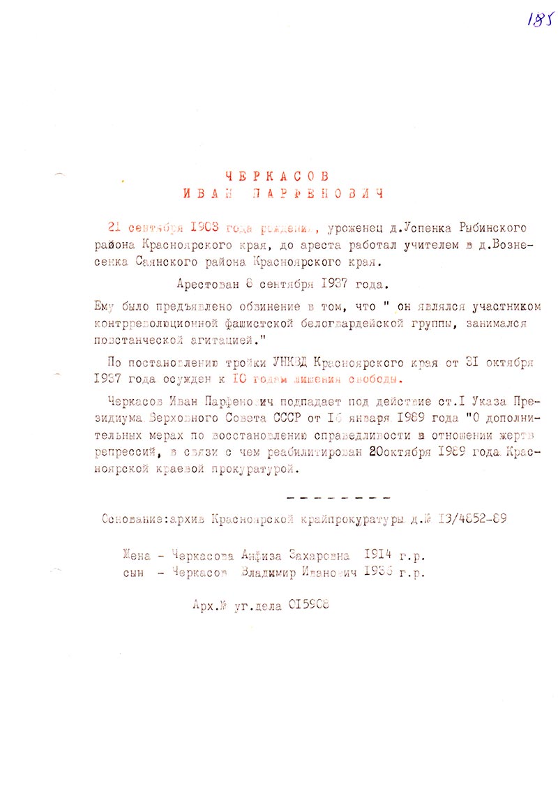 Черкасов Иван Парфенович подпадает под действие ст. 1 Указа Президиума. Верховного Совета СССР от 16 января 1989 года “О дополнительных мерах по восстановлению справедливости в отношении жертв репрессий, в связи с чем реабилитирован 20 октября 1989 года Красноярской краевой прокуратурой.
