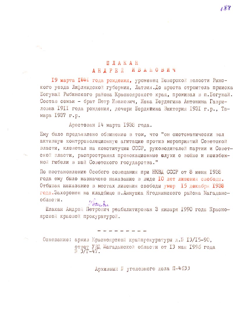 Шлакан Андрей Иванович реабилитирован 3 января 1990 года Красноярской краевой