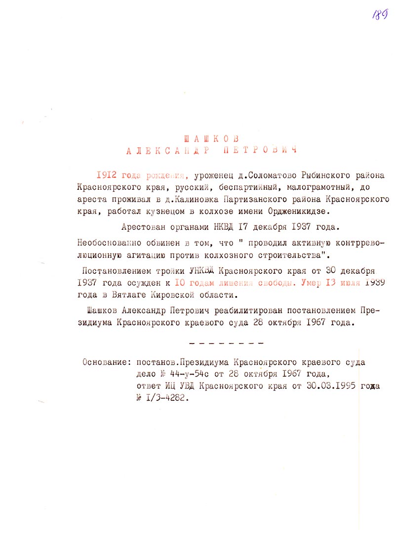 Шашков Александр Петрович реабилитирован постановлением Президиума Красноярского краевого суда 28 октября 1967 года.