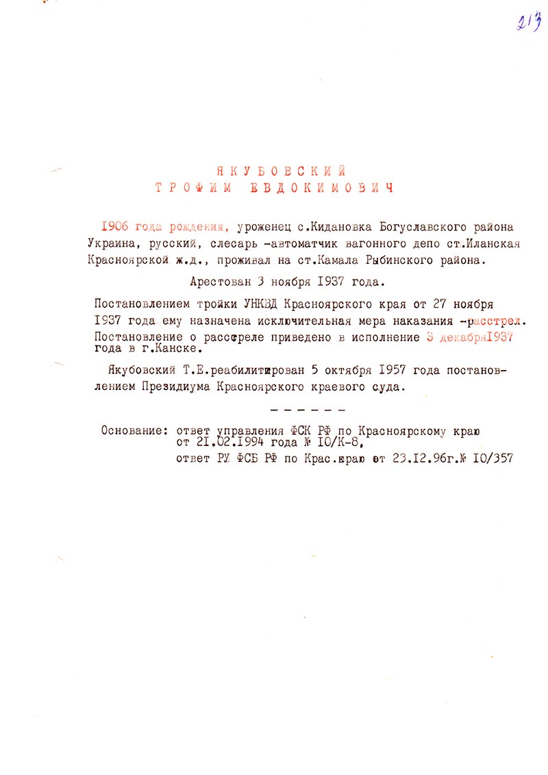 Якубовский Т.Е. реабилитирован 5 октября 1957 года постановлением Президиума Красноярского краевого суда.