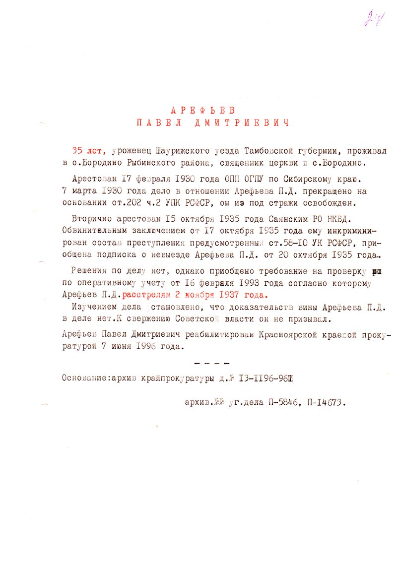 Арефьев Павел Дмитриевич реабилитирован Красноярской краевой прокуратурой 7 июня