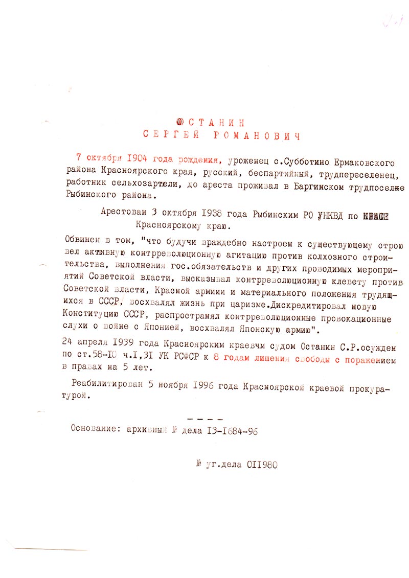 24 апреля 1939 года Красноярским краевым судом Останин С.Р. осужден по ст. 58-10 ч. 1, 31 УК РСФСР к 8 годам лишения свободы с поражением в правах на 5 лет.